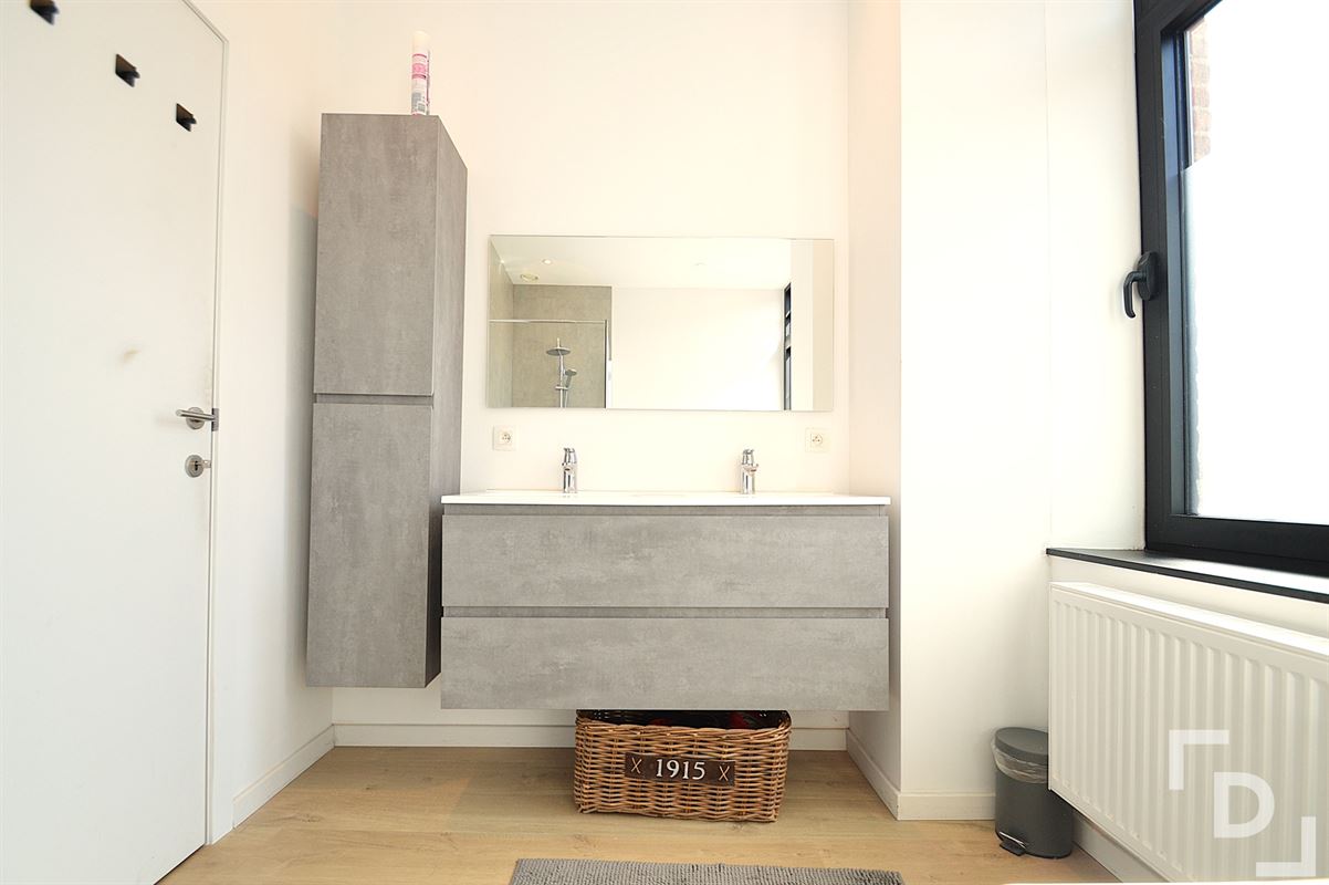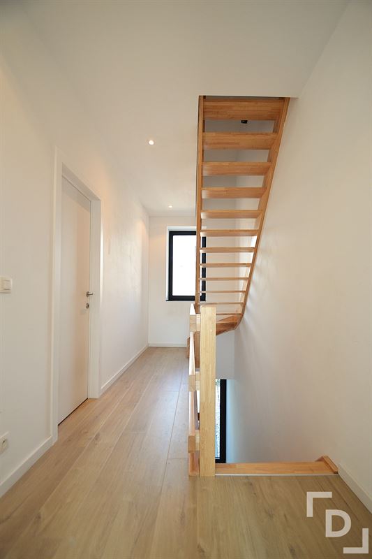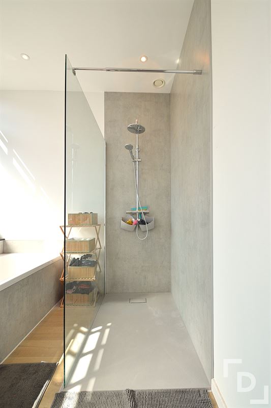 Terug binnen treffen we op de eerste verdieping een eerste slaapkamer (349*349) aan. Deze is voorzien van een extra ruimte die perfect dienst kan doen als dressing, bureauruimte of eventuele vierde slaapkamer. Verder ligt op dit niveau nog een apart toilet en de moderne badkamer. Deze is voorzien van een inloopdouche, een ligbad, een dubbele wastafel in meubel en extra linnenkast. Een verdieping hoger bevinden zich dan nog de twee andere slaapkamers (391*313 & 335*313), een bijkomende bergplaats en de chauffageruimte. Er wordt verwarmd via een condensatieketel op gas, het ventilatiesysteem zorgt voor de verluchting en de zes zonnepanelen wekken extra groene stroom op.