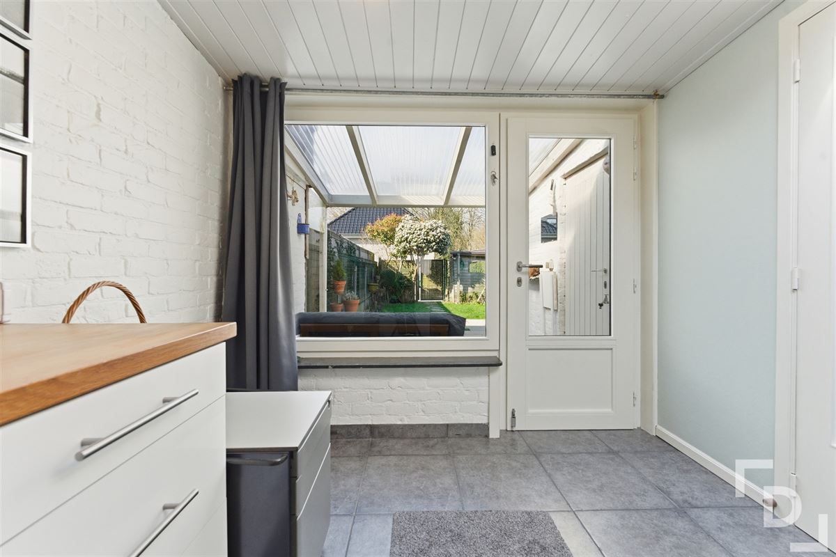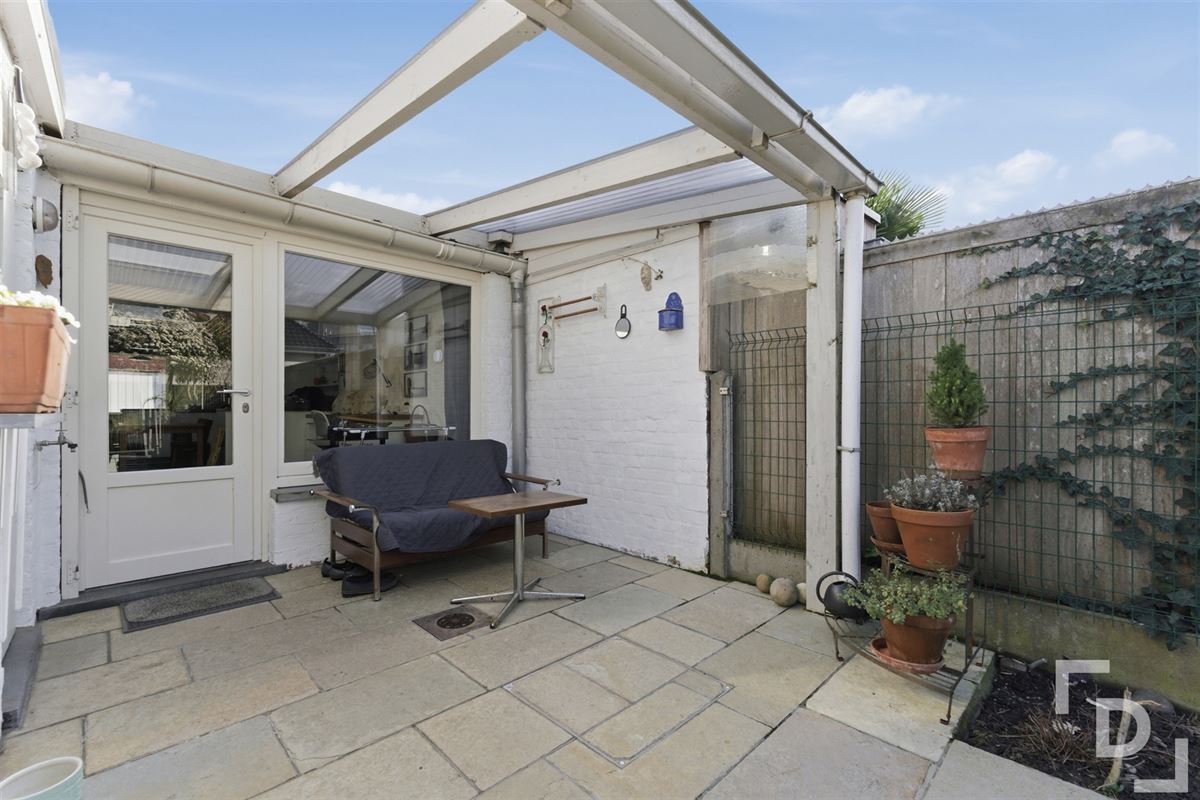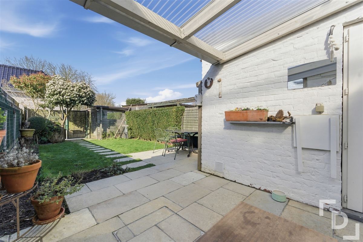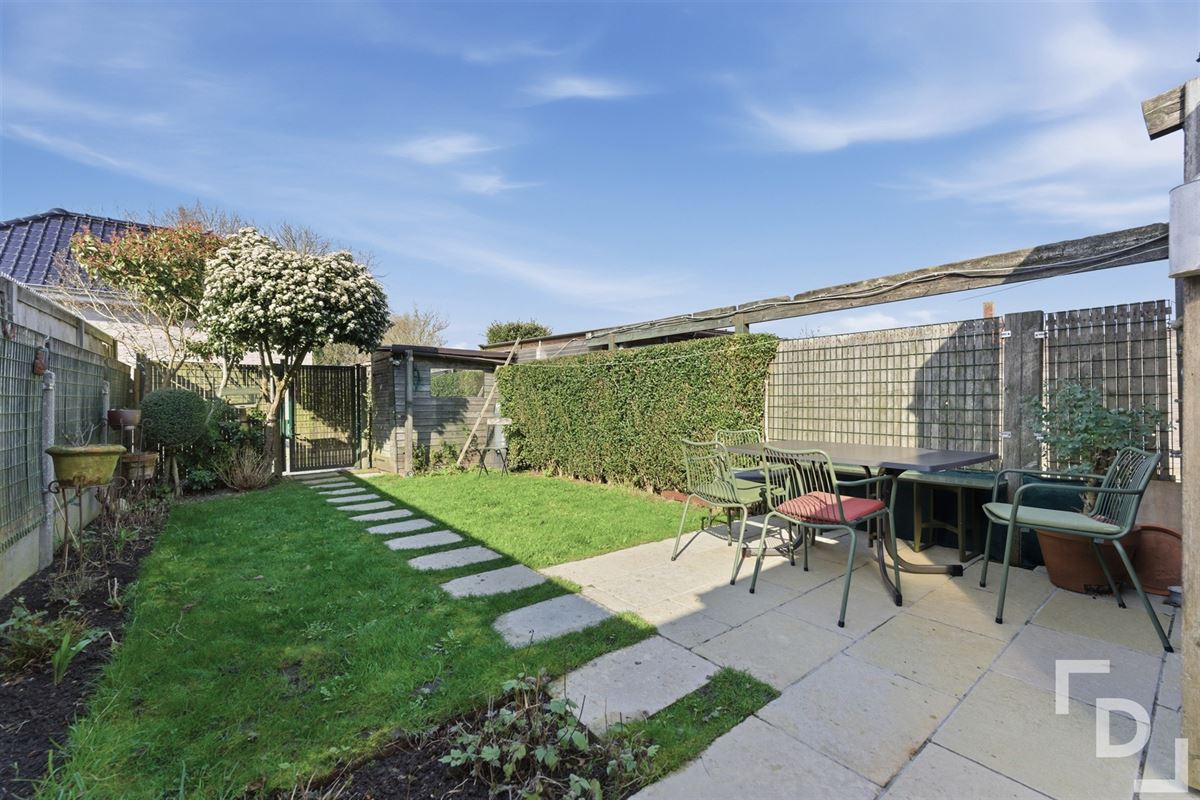 Buiten vinden we een aparte bergruimte, een terras en tuin met uitweg.