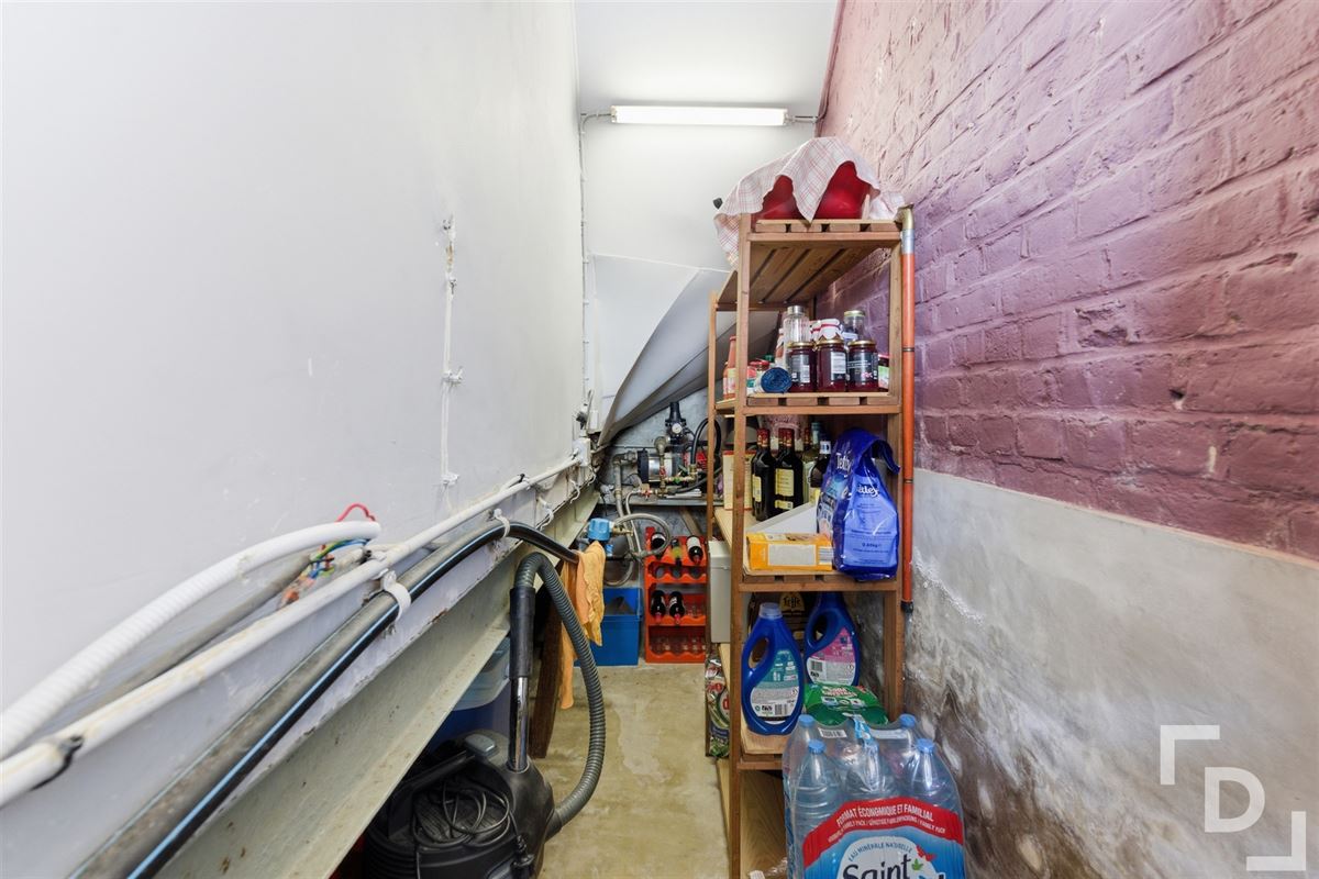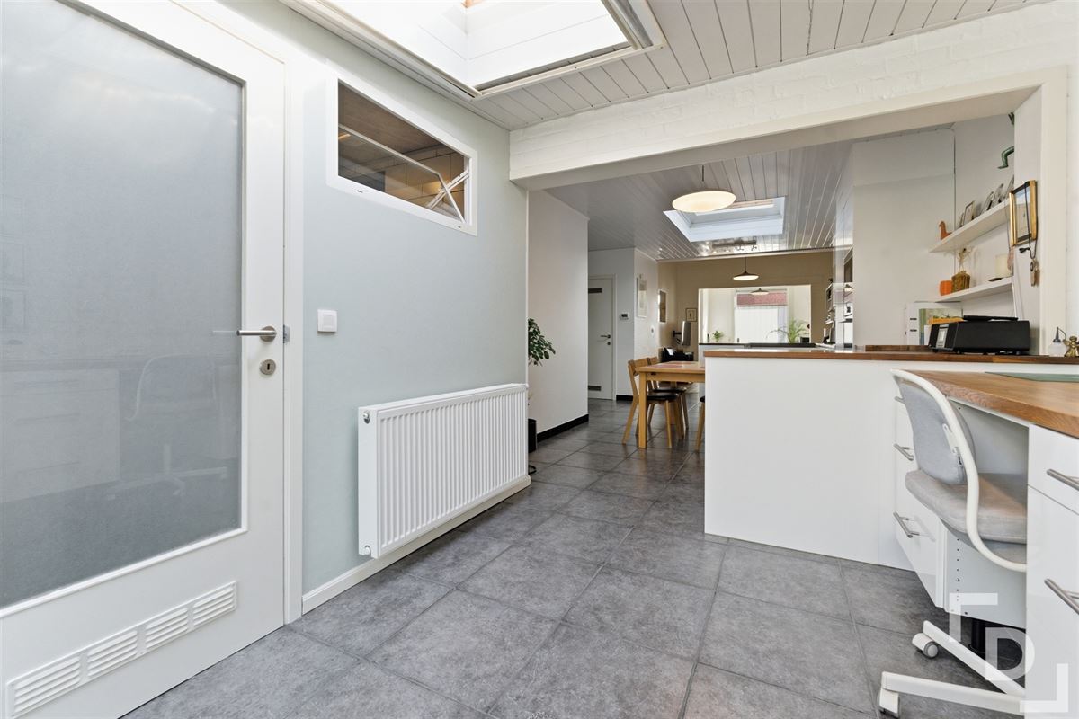 Aan de straatkant van de leefruimte vinden we een bureauruimte voorzien van een pelletkachel, vervolgens is deze ruimte aangesloten tot een gezellige zithoek en toegang tot de kelder, een aparte bergruimte en een apart toilet.