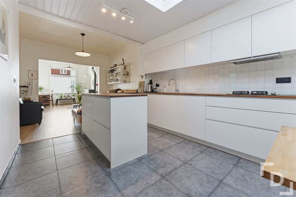 Verder op het gelijkvloers vinden we een open keuken die nog maar recent in 2022 werd geplaatst en op het einde van de uitbouw een functionele ruimte met aanpalend de badkamer voorzien van toilet, wasmeubel en douchel in bad.